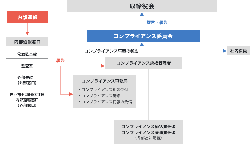 当社では、コンプライアンス委員会を年2回開催し、コンプライアンスの取り組み及び法令等の違反行為について、当委員会に報告し、その評価や意見を取締役会に提言・報告しています。