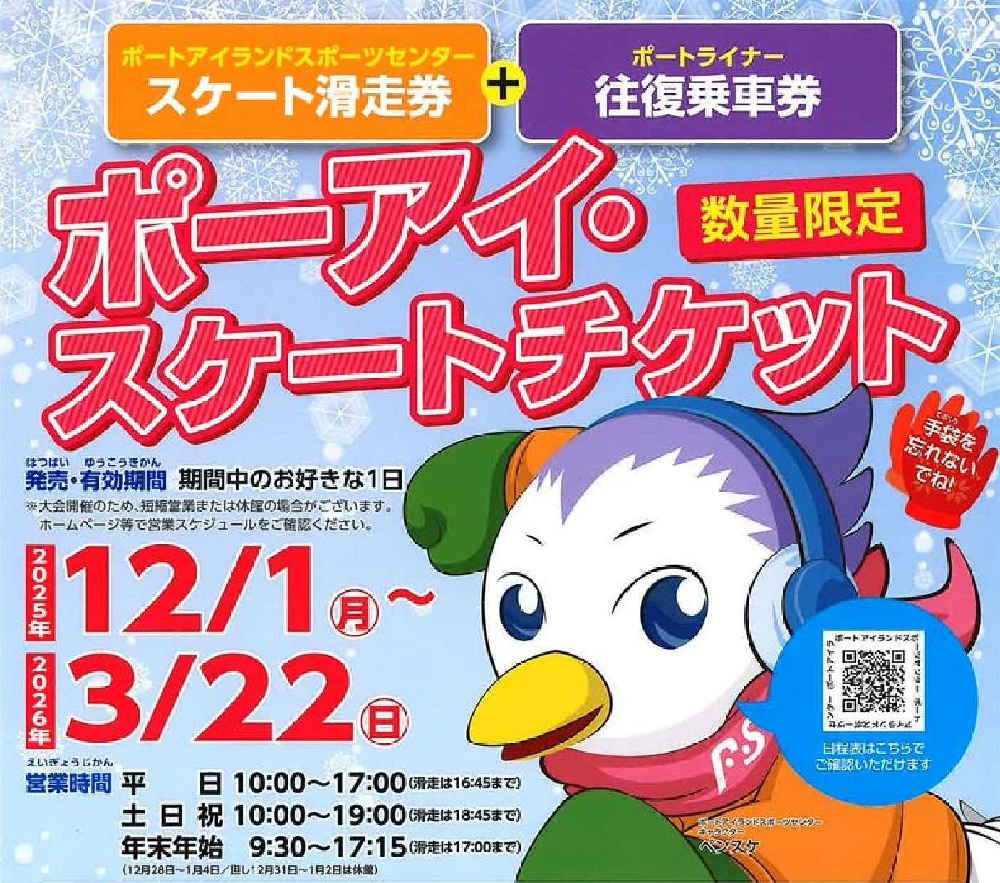 いよいよアイススケートのシーズン到来です! 毎年恒例となりましたポートアイランドスポーツセンターのスケート滑走券とポートライナーの往復乗車券を組み合わせた、お得なセット券「ポーアイ・スケートチケット」を発売いたします。 ぜひ、この機会にお越しください。- 発売期間